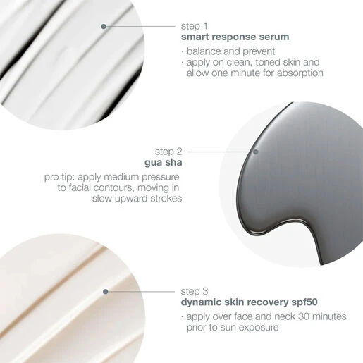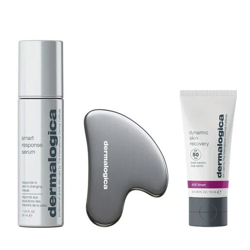 The Dermalogica Smart Response Serum Kit features a full size Smart Response Serum as well as a free Dynamic Skin Recovery SPF50 travel size and Gua Sha.